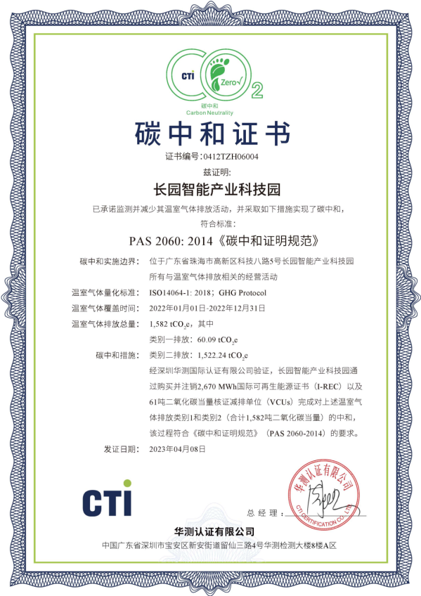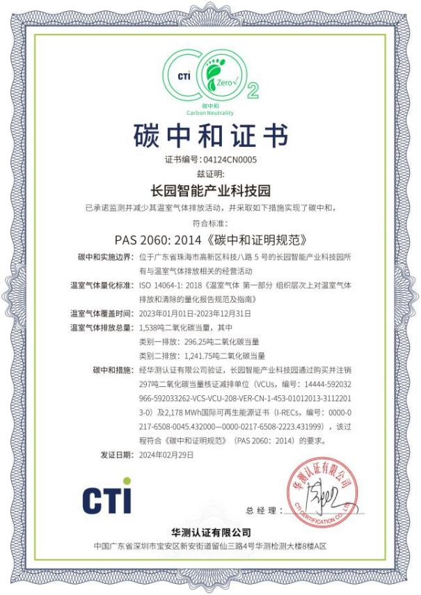 近日,HTH.COM-华体会huatihui科技集团位于珠海高新区的“HTH.COM-华体会huatihui智能产业科技园”完成了2023年度运营层面的碳中和认证工作,这一重要成就标志着该园区已连续两年实现碳中和目标。